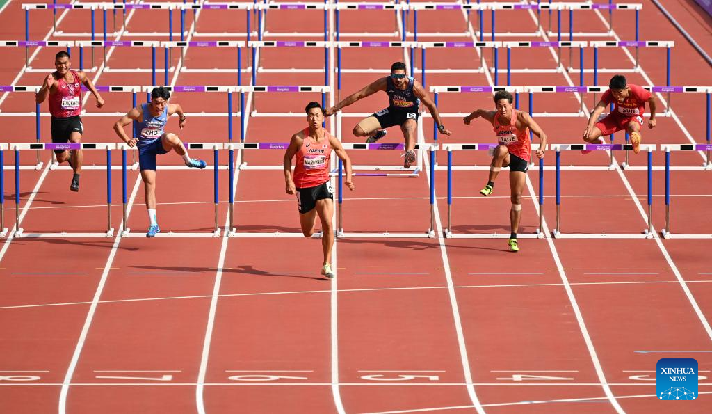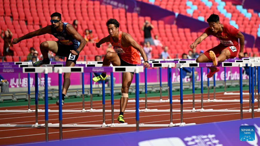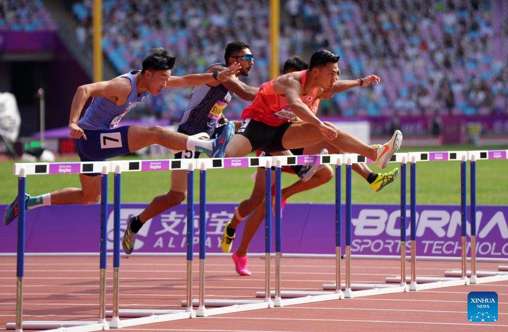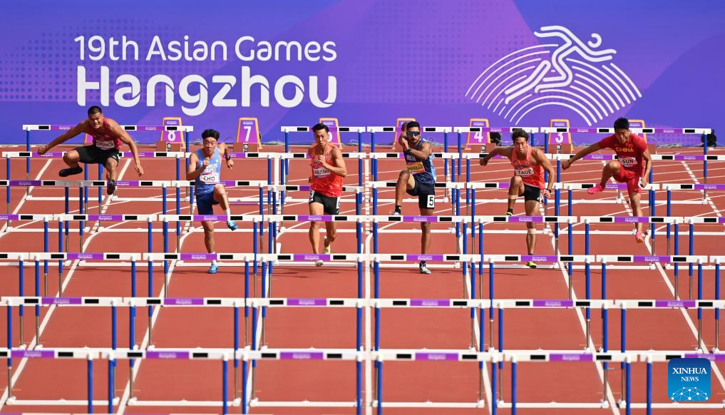 Athletes compete during the Men's Decathlon 110m Hurdles of Athletics at the 19th Asian Games in Hangzhou, east China's Zhejiang Province, Oct. 3, 2023. (Xinhua/Jiang Han)