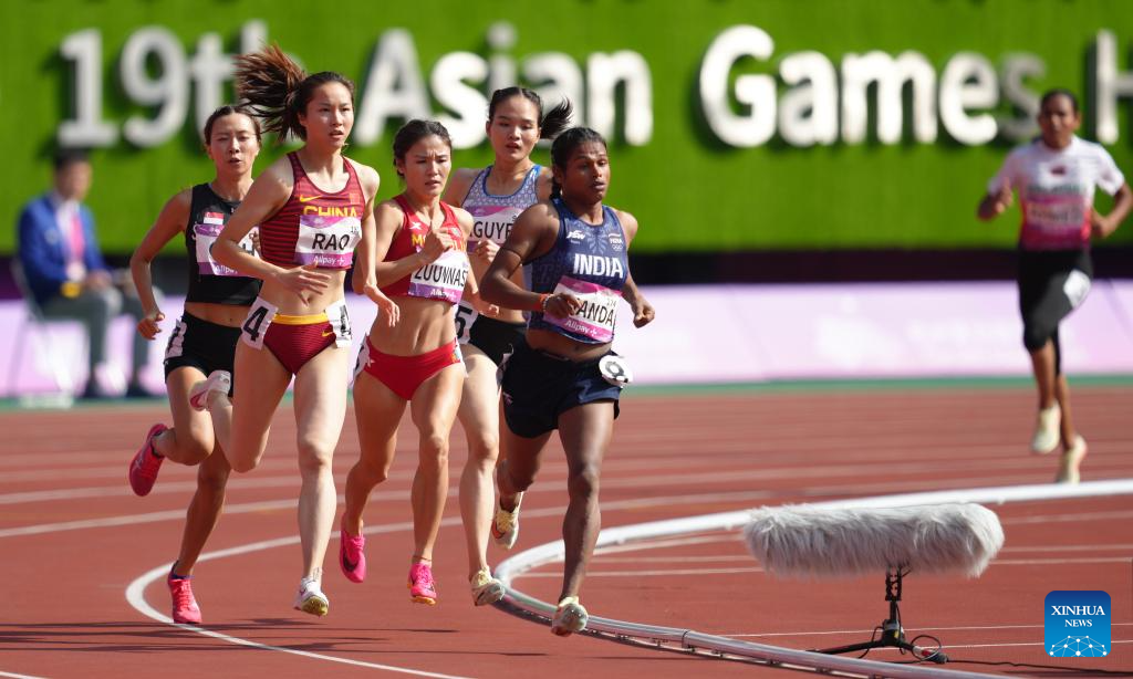 Rao Xinyu (2nd L) of China competes during the Women's 800m Heat of Athletics at the 19th Asian Games in Hangzhou, east China's Zhejiang Province, Oct. 3, 2023. (Xinhua/Jiang Wenyao)