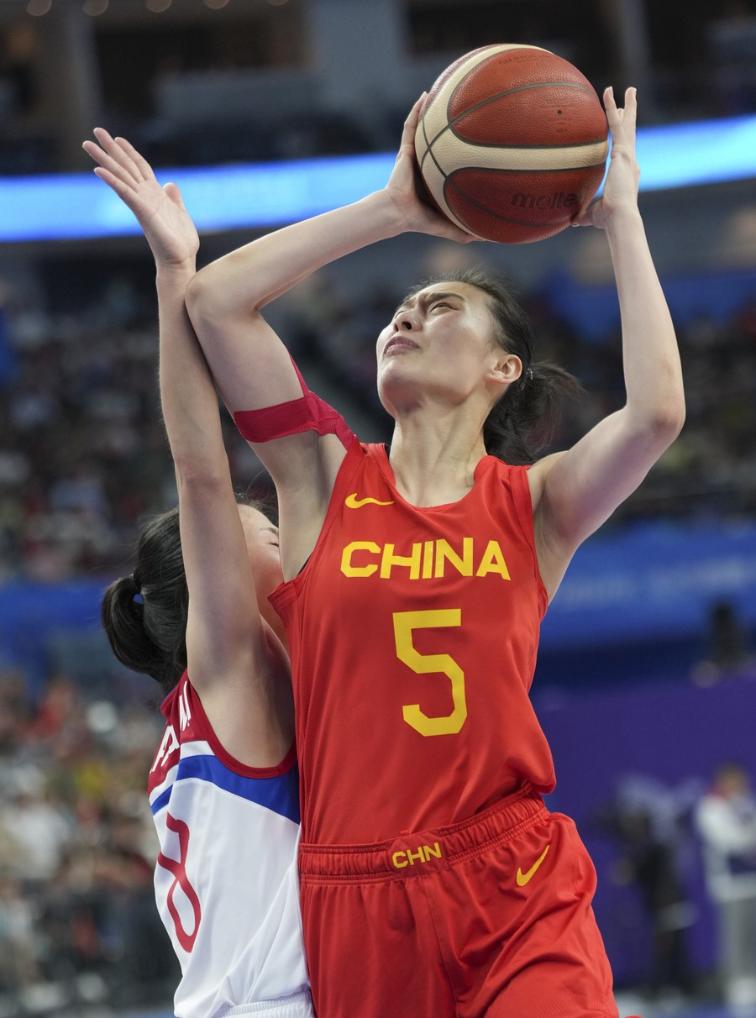 Chinese player Wang Siyu (R) in action during the match against DPR Korea in the semifinals of the women's basketball tournament at the 19th Asian Games in Hangzhou, east China's Zhejiang Province on Oct. 3, 2023. (Xinhua/Meng Yongmin)