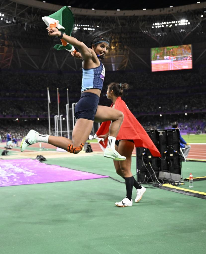 Ancy Sojan Edappilly of India celebrates after the Women's Long Jump Final of Athletics at the 19th Asian Games in Hangzhou, east China's Zhejiang Province, Oct. 2, 2023. (Xinhua/Song Yanhua)