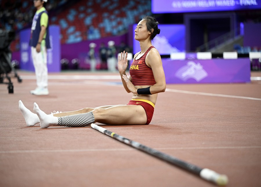 Li Ling of China reacts during the Women's Pole Vault Final of Athletics at the 19th Asian Games in Hangzhou, east China's Zhejiang Province, Oct. 2, 2023. (Xinhua/Song Yanhua)