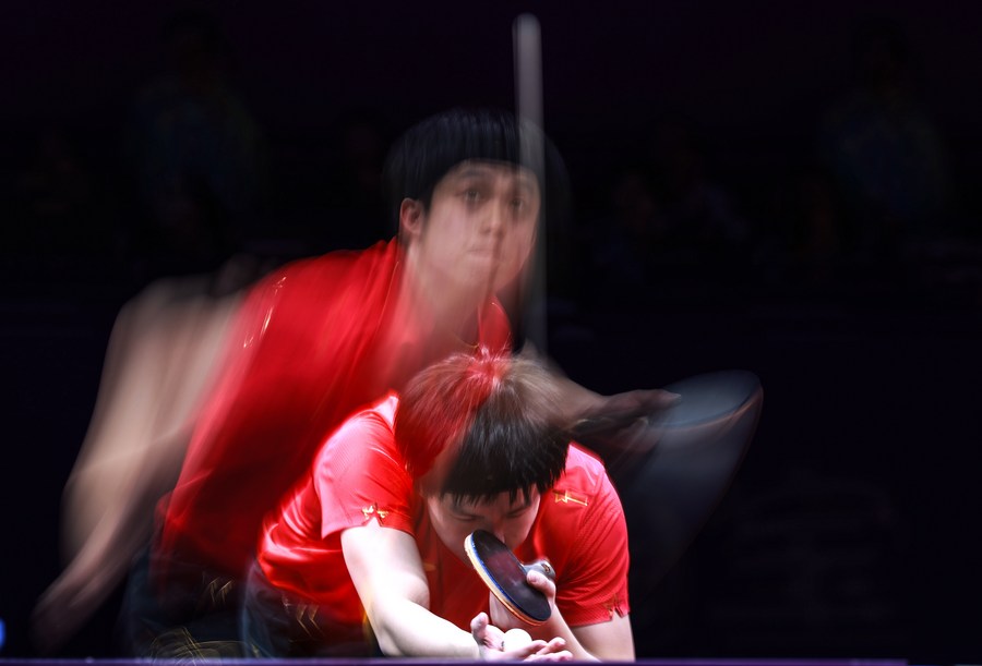 Wang Chuqin of China competes during Men's Singles Gold Medal Match of table tennis at the 19th Asian Games in Hangzhou, east China's Zhejiang Province, Oct. 2, 2023. (Xinhua/Liu Xu)