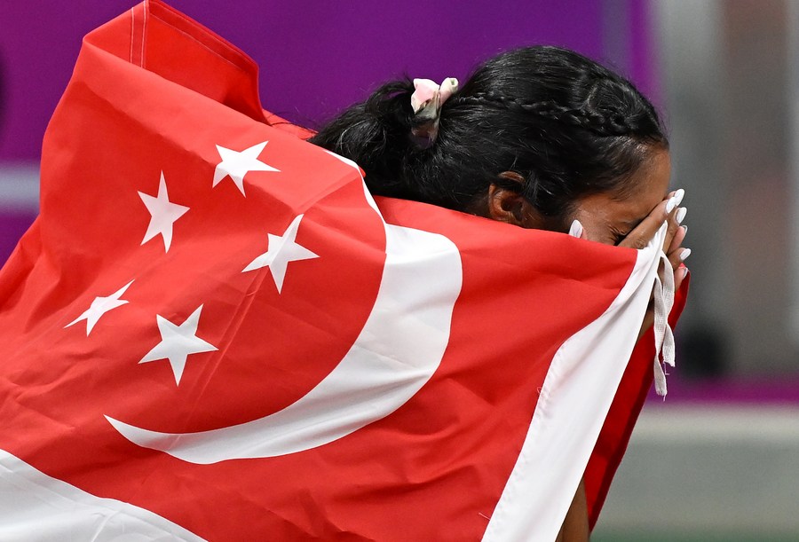 Pereira Veronica Shanti of Singapore reacts after the Women's 200m Final of Athletics at the 19th Asian Games in Hangzhou, east China's Zhejiang Province, Oct. 2, 2023. (Xinhua/Li Yibo)