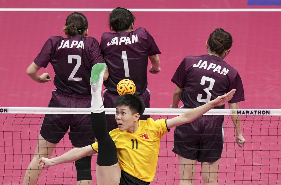 Nguyen Thi Yen (front) of Vietnam competes during Women's Quadrant Preliminary match of Sepaktakraw between Vietnam and Japan at the 19th Asian Games in Jinhua, east China's Zhejiang Province, Oct. 2, 2023. (Xinhua/Chen Zhonghao)