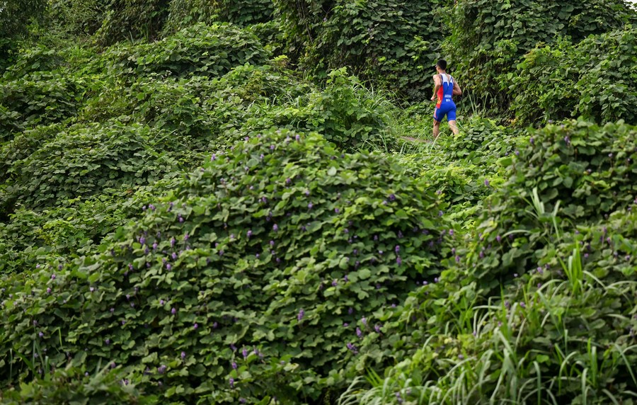 Amarsanaa Ganbaatar of Mongolia competes during the Triathlon Mixed Relay at the 19th Asian Games in Chun'an County, east China's Zhejiang Province, Oct. 2, 2023. (Xinhua/Hu Huhu)