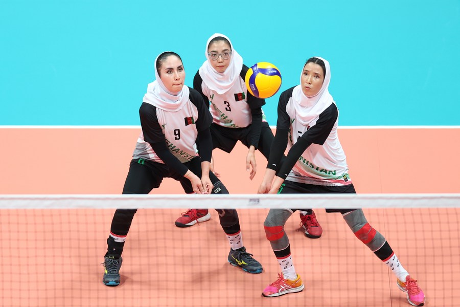 Players of Afghanistan compete during Women's Preliminary Round Pool D of Volleyball between China's Hong Kong and Afghanistan at the 19th Asian Games in Hangzhou, east China's Zhejiang Province, Oct. 2, 2023. (Xinhua/Zhang Tao)■