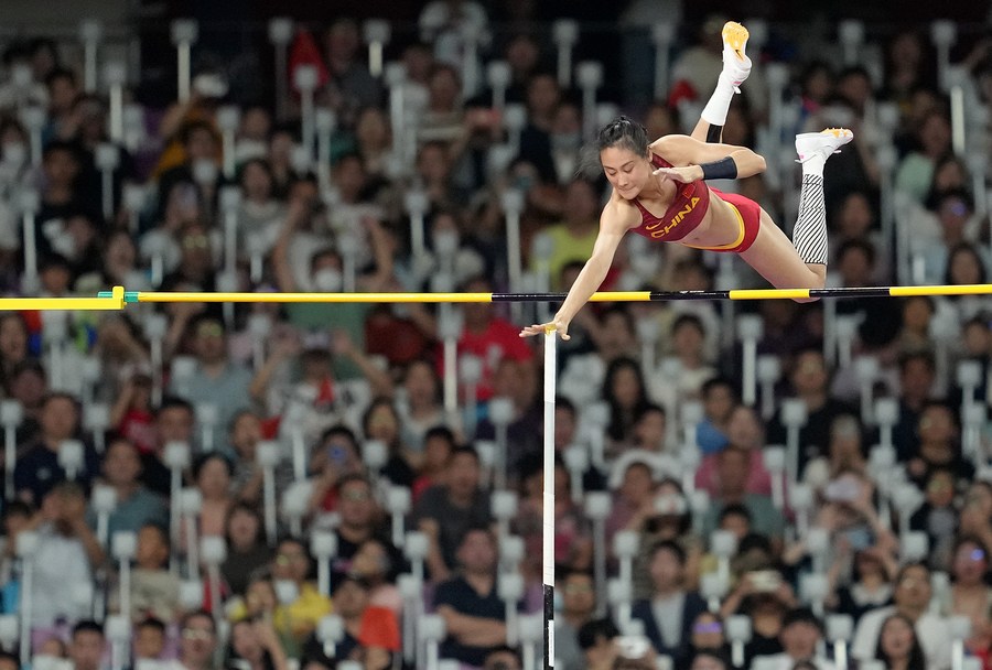 Li Ling of China competes during the Women's Pole Vault Final of Athletics at the 19th Asian Games in Hangzhou, east China's Zhejiang Province, Oct. 2, 2023. (Xinhua/Jiang Wenyao)