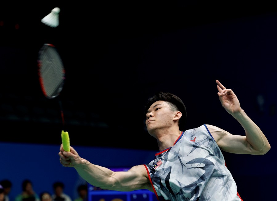 Lee Zii Jia of Malaysia competes in the badminton men's singles round of 16 against Kunlavut Vitidsarn of Thailand at the Hangzhou Asian Games on Oct. 4, 2023. (Xinhua/Ren Zhenglai)