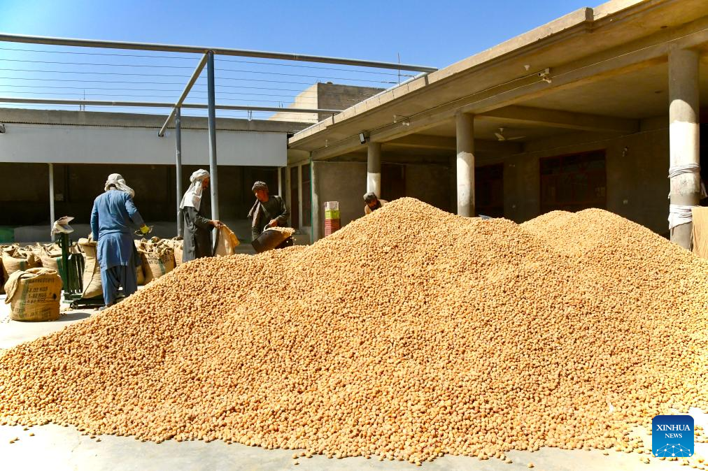 Workers sort dried apricots at a factory in Kandahar Province, Afghanistan, Oct. 3, 2023. (Photo by Arghand/Xinhua)