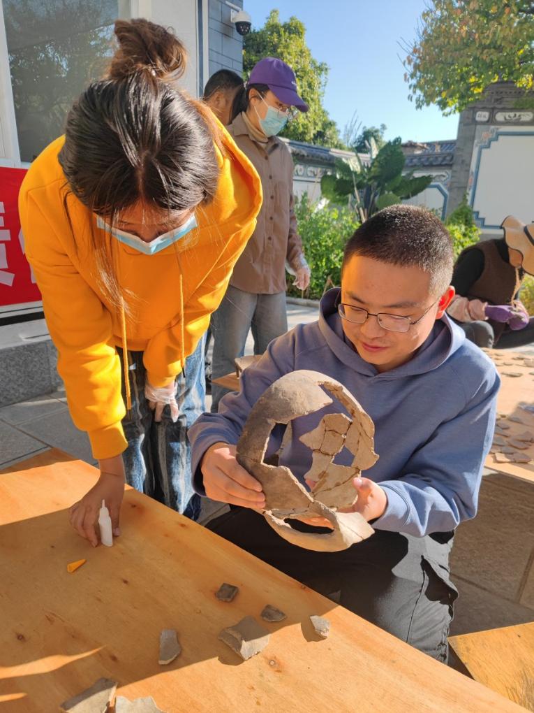 Fu Jie (R), a doctoral candidate from Sichuan University, leads an intern to put pottery pieces together at an archaeological workstation in Dali Bai Autonomous Prefecture, southwest China's Yunnan Province, Nov. 8, 2022. (Photo by He Qionghui/Xinhua)