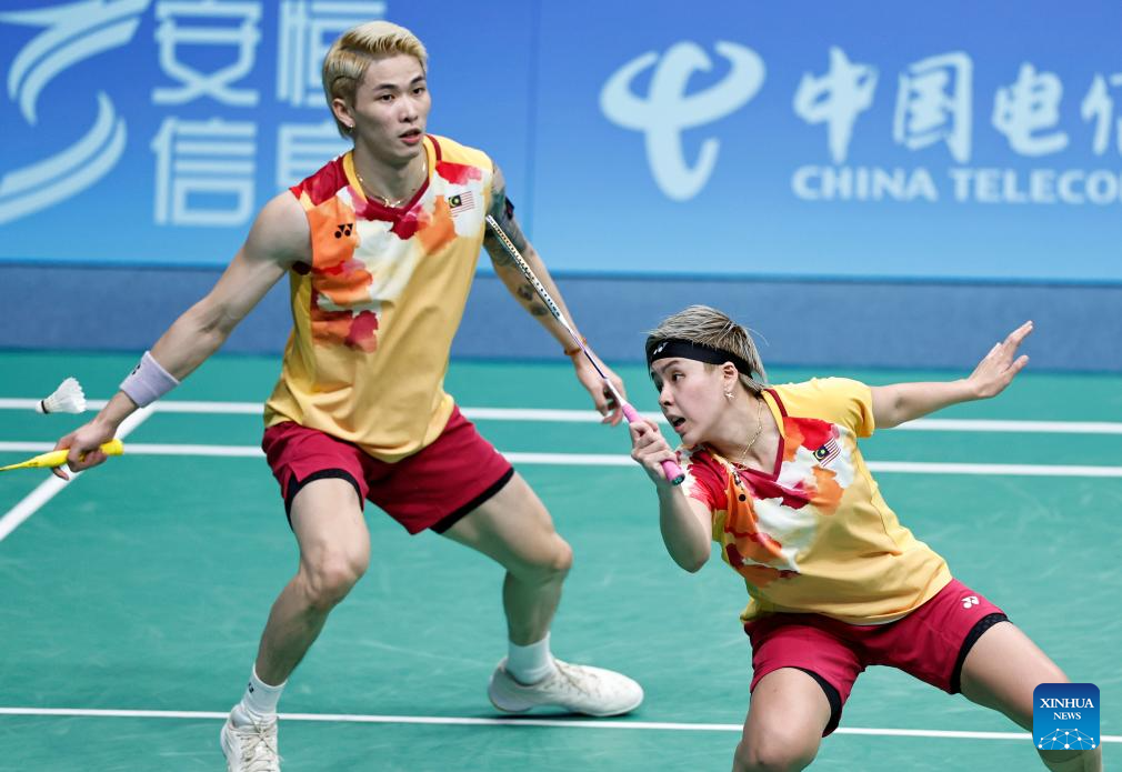 Chen Tang Jie (L)/Toh Ee Wei of Malaysia compete during the Mixed Doubles Quarterfinal of Badminton between Zheng Siwei/Huang Yaqiong of China and Chen Tang Jie/Toh Ee Wei of Malaysia at the 19th Asian Games in Hangzhou, east China's Zhejiang Province, Oct. 5, 2023. (Xinhua/Ren Zhenglai)