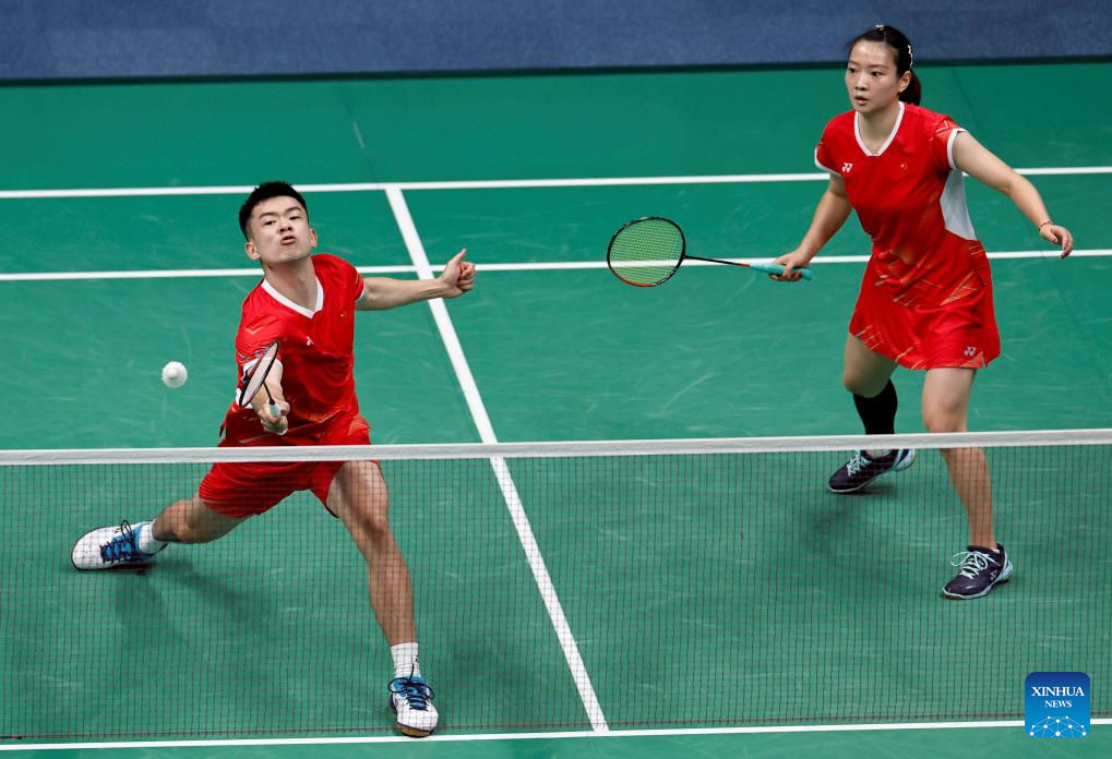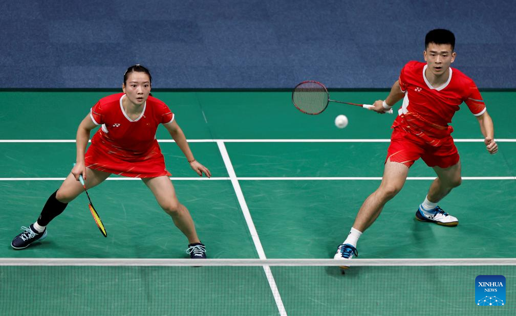 Zheng Siwei (L)/Huang Yaqiong of China compete during the Mixed Doubles Quarterfinal of Badminton between Zheng Siwei/Huang Yaqiong of China and Chen Tang Jie/Toh Ee Wei of Malaysia at the 19th Asian Games in Hangzhou, east China's Zhejiang Province, Oct. 5, 2023. (Xinhua/Ren Zhenglai)