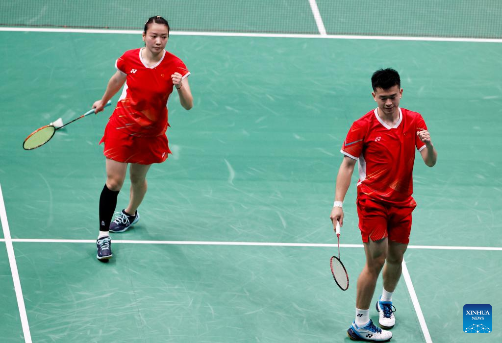 Zheng Siwei (R)/Huang Yaqiong of China react during the Mixed Doubles Quarterfinal of Badminton between Zheng Siwei/Huang Yaqiong of China and Chen Tang Jie/Toh Ee Wei of Malaysia at the 19th Asian Games in Hangzhou, east China's Zhejiang Province, Oct. 5, 2023. (Xinhua/Ren Zhenglai)