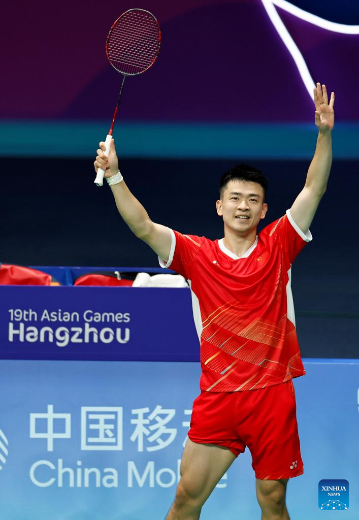 Zheng Siwei of China celebrates after the Mixed Doubles Quarterfinal of Badminton between Zheng Siwei/Huang Yaqiong of China and Chen Tang Jie/Toh Ee Wei of Malaysia at the 19th Asian Games in Hangzhou, east China's Zhejiang Province, Oct. 5, 2023. (Xinhua/Ren Zhenglai)