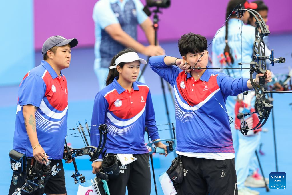 Chen Yi-Hsuan(R), Huang I-Jou(L) and Wang Lu-Yun of Chinese Taipei compete during the Compound Women's Team Gold Medal Match of Archery between India and Chinese Taipei at the 19th Asian Games in Hangzhou, east China's Zhejiang Province, Oct. 5, 2023. (Xinhua/Shan Yuqi)