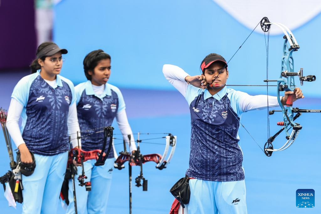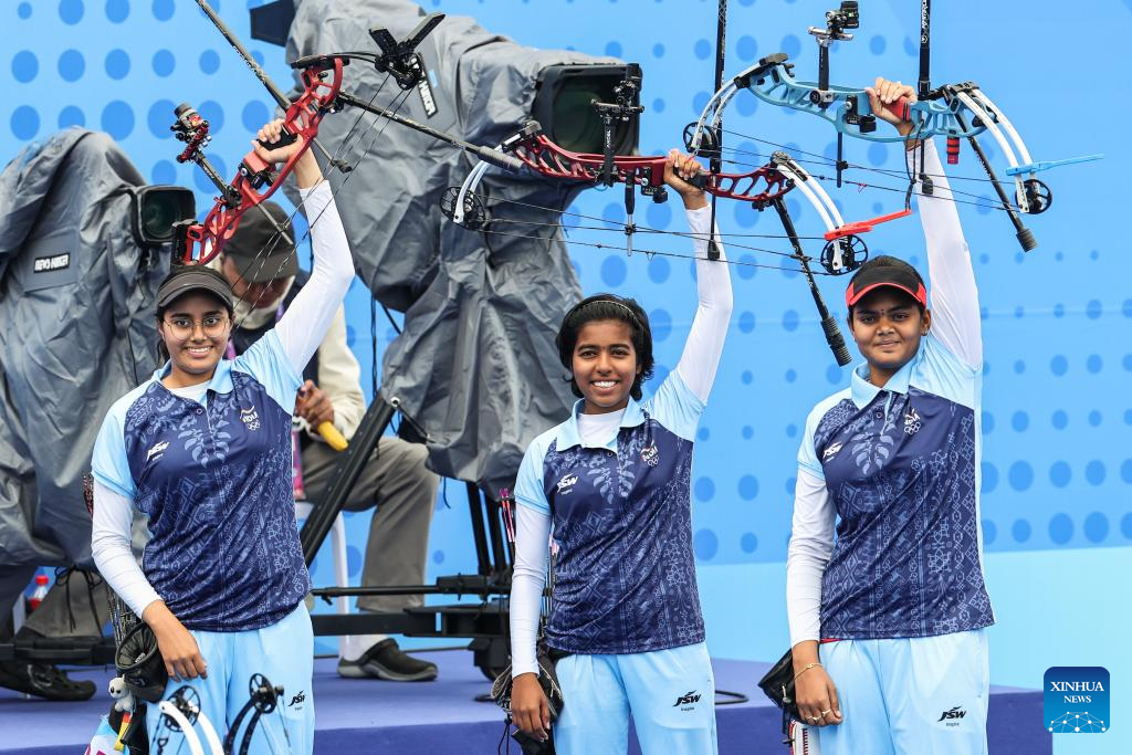 Jyothi Surekha Vennam (R), Aditi Gopichand Swami (C) and Parneet Kaur of India compete during the Compound Women's Team Gold Medal Match of Archery between India and Chinese Taipei at the 19th Asian Games in Hangzhou, east China's Zhejiang Province, Oct. 5, 2023. (Xinhua/Shan Yuqi)