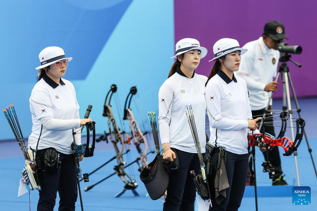 So Chaewon (R), Oh Yoohyun (C) and Cho Sua of South Korea compete during the Compound Women's Team Bronze Medal Match of Archery between South Korea and Indonesia at the 19th Asian Games in Hangzhou, east China's Zhejiang Province, Oct. 5, 2023. (Xinhua/Shan Yuqi)