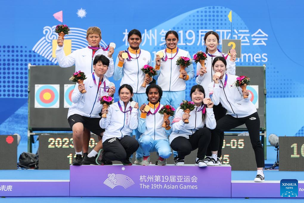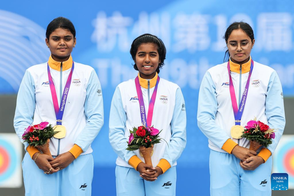 Gold medalists team India, silver medalists team Chinese Taipei and bronze medalists team South Korea attend the awarding ceremony of the Compound Women's Team of Archery at the 19th Asian Games in Hangzhou, east China's Zhejiang Province, Oct. 5, 2023. (Xinhua/Shan Yuqi)
