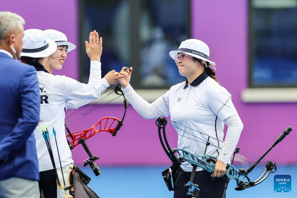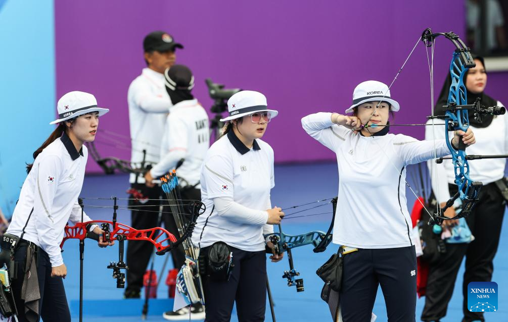 So Chaewon (L), Oh Yoohyun (C) and Cho Sua of South Korea compete during the Compound Women's Team Bronze Medal Match of Archery between South Korea and Indonesia at the 19th Asian Games in Hangzhou, east China's Zhejiang Province, Oct. 5, 2023. (Xinhua/Shan Yuqi)