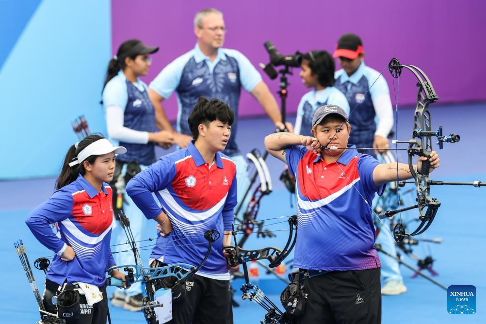 Chen Yi-Hsuan(C), Huang I-Jou(R) and Wang Lu-Yun of Chinese Taipei compete during the Compound Women's Team Gold Medal Match of Archery between India and Chinese Taipei at the 19th Asian Games in Hangzhou, east China's Zhejiang Province, Oct. 5, 2023. (Xinhua/Shan Yuqi)