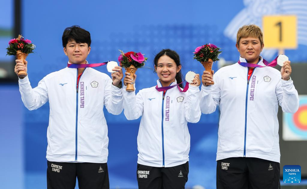 Silver medalists Chen Yi-Hsuan(L), Huang I-Jou(R) and Wang Lu-Yun of Chinese Taipei attend the awarding ceremony of the Compound Women's Team of Archery at the 19th Asian Games in Hangzhou, east China's Zhejiang Province, Oct. 5, 2023. (Xinhua/Shan Yuqi)