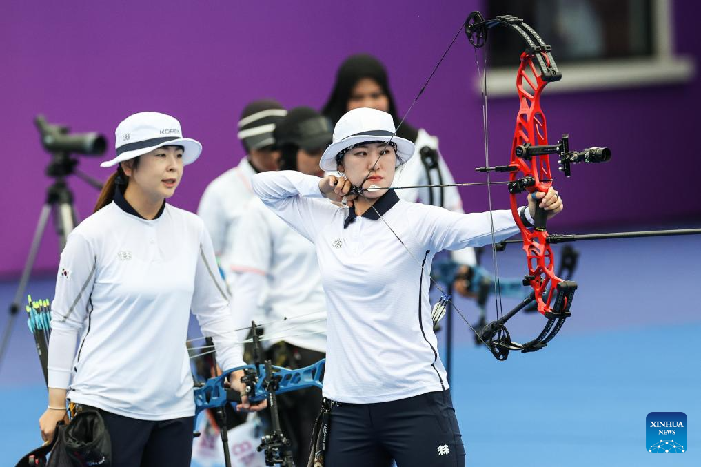 So Chaewon (R) and Oh Yoohyun of South Korea compete during the Compound Women's Team Bronze Medal Match of Archery between South Korea and Indonesia at the 19th Asian Games in Hangzhou, east China's Zhejiang Province, Oct. 5, 2023. (Xinhua/Shan Yuqi)