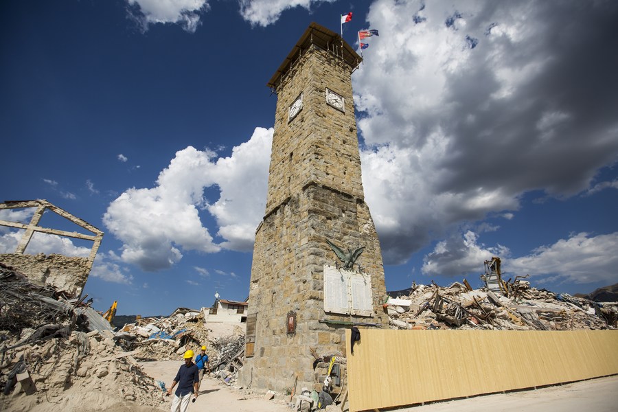 People walk past a clock tower in Amatrice, central Italy, on Aug. 24, 2017. Ruins, lost memories, and silence are all that remain here one year after a major earthquake struck central Italy. Out of the 300 victims, 239 people died in Amatrice, 10 in the nearby village of Accumoli, and the other 51 were killed in surrounding areas. (Xinhua/Jin Yu)