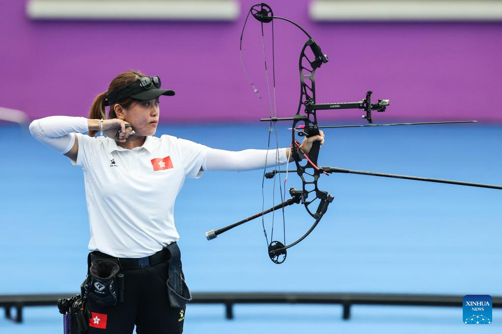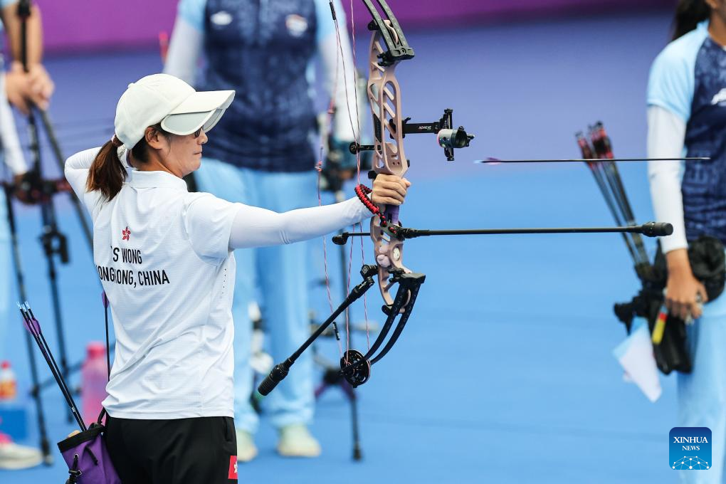 Wong Yuk Sheung of China's Hong Kong competes during the Compound Women's Team Quarterfinal of Archery at the 19th Asian Games in Hangzhou, east China's Zhejiang Province, Oct. 5, 2023. (Xinhua/Shan Yuqi)