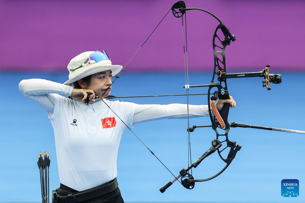 Cheng Hung Ting of China's Hong Kong competes during the Compound Women's Team Quarterfinal of Archery at the 19th Asian Games in Hangzhou, east China's Zhejiang Province, Oct. 5, 2023. (Xinhua/Shan Yuqi)