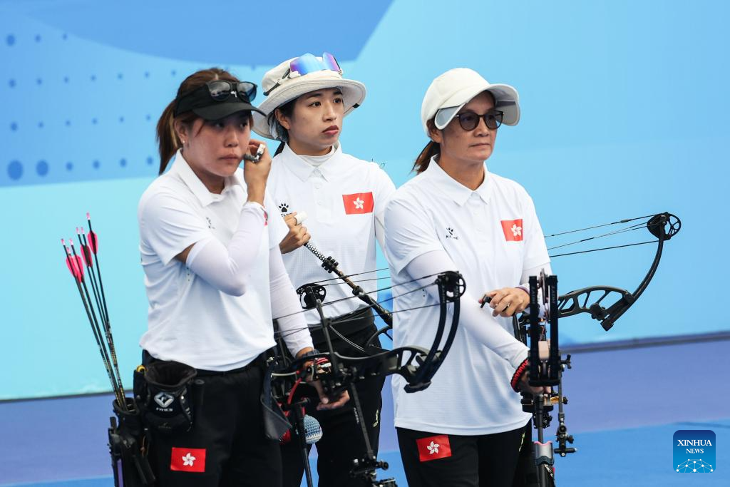 Cheng Hung Ting (C)/Wong Yuk Sheung (R)/Luk Yin Yi of China's Hong Kong compete during the Compound Women's Team Quarterfinal of Archery at the 19th Asian Games in Hangzhou, east China's Zhejiang Province, Oct. 5, 2023. (Xinhua/Shan Yuqi)