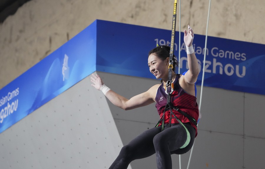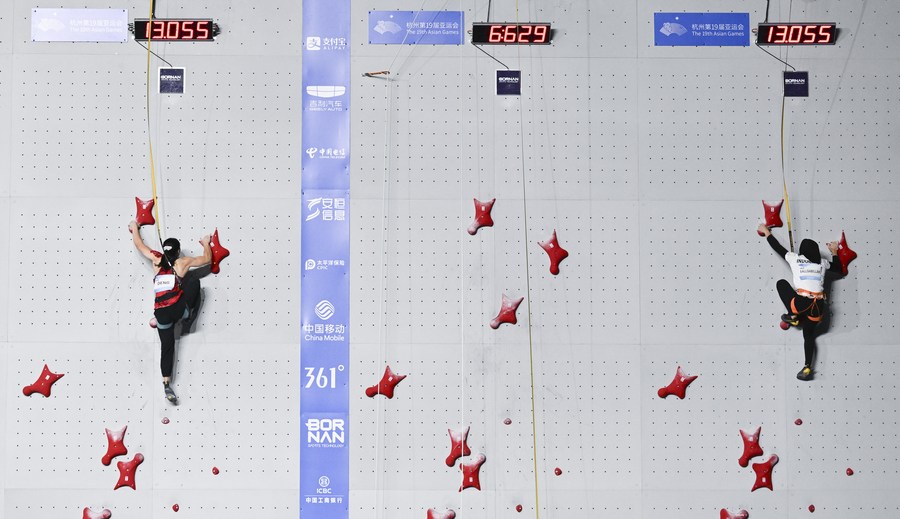 HANGZHOU, Oct. 4 (Xinhua) -- After settling for two silvers on the opening day of sport climbing, China outran Indonesia in both men's and women's speed relay finals to clinch a golden double at the Hangzhou Asian Games here on Wednesday.
