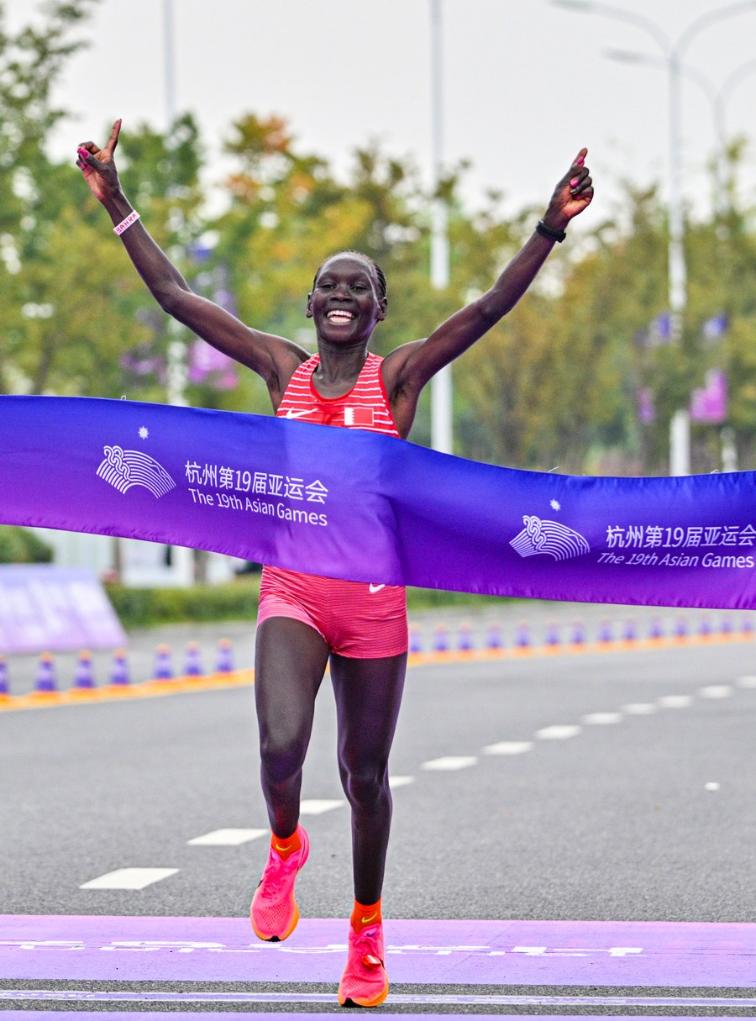 Eunice Chebichii Paul Chumba of Bahrain crosses the finishing line during the women's marathon at the Hangzhou Asian Games, Oct. 5, 2023. (Xinhua/Sun Fei)