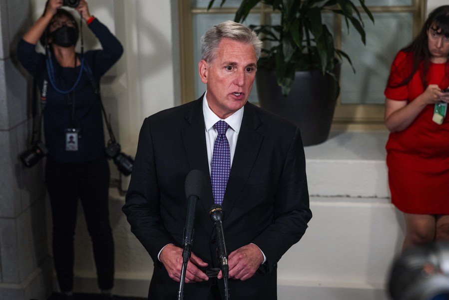 File photo taken on Sept. 29, 2023, shows then U.S. House Speaker Kevin McCarthy (front) speaking to the media in Washington, D.C., the United States. (Photo by Aaron Schwartz/Xinhua)