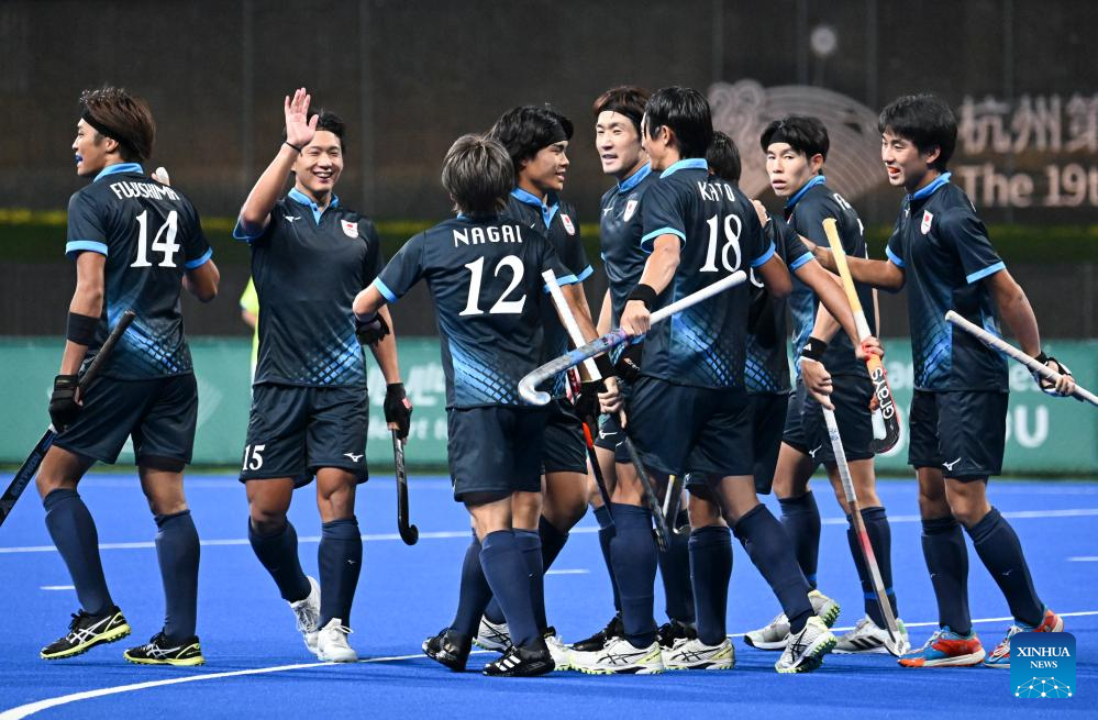 Team Japan celebrate scoring during Men's Semifinal of Hockey between China and Japan at the 19th Asian Games in Hangzhou, east China's Zhejiang Province, Oct. 4, 2023. (Xinhua/Li An)