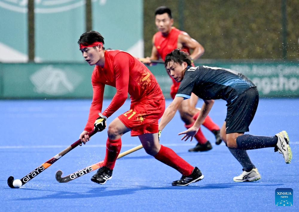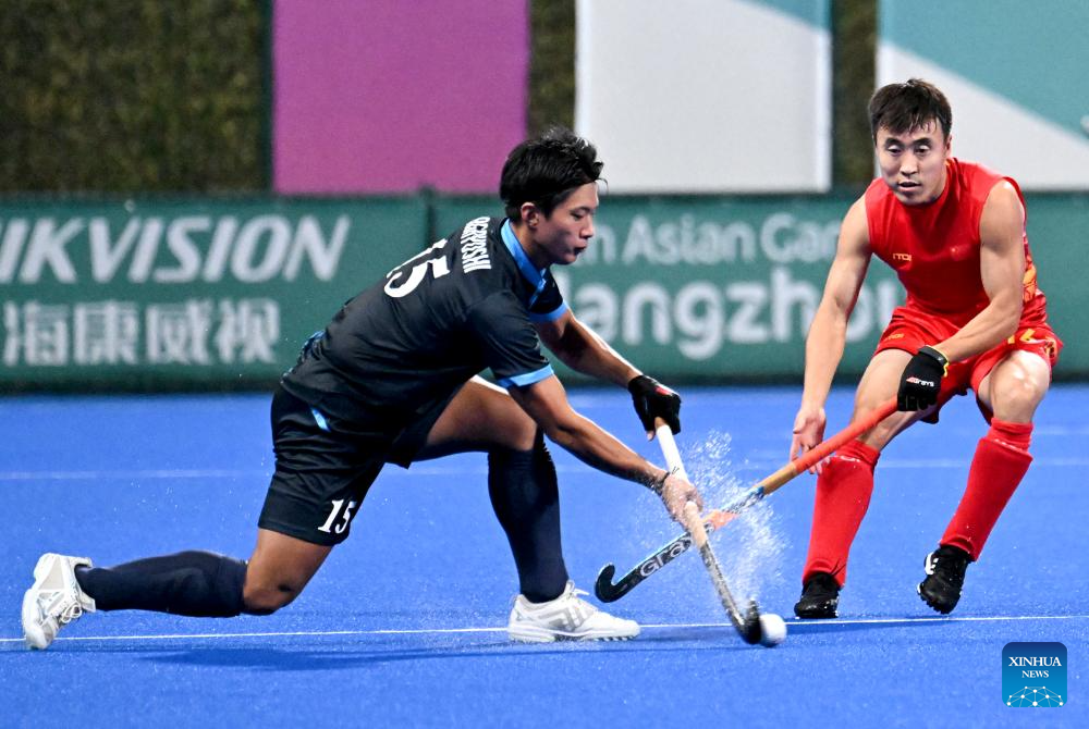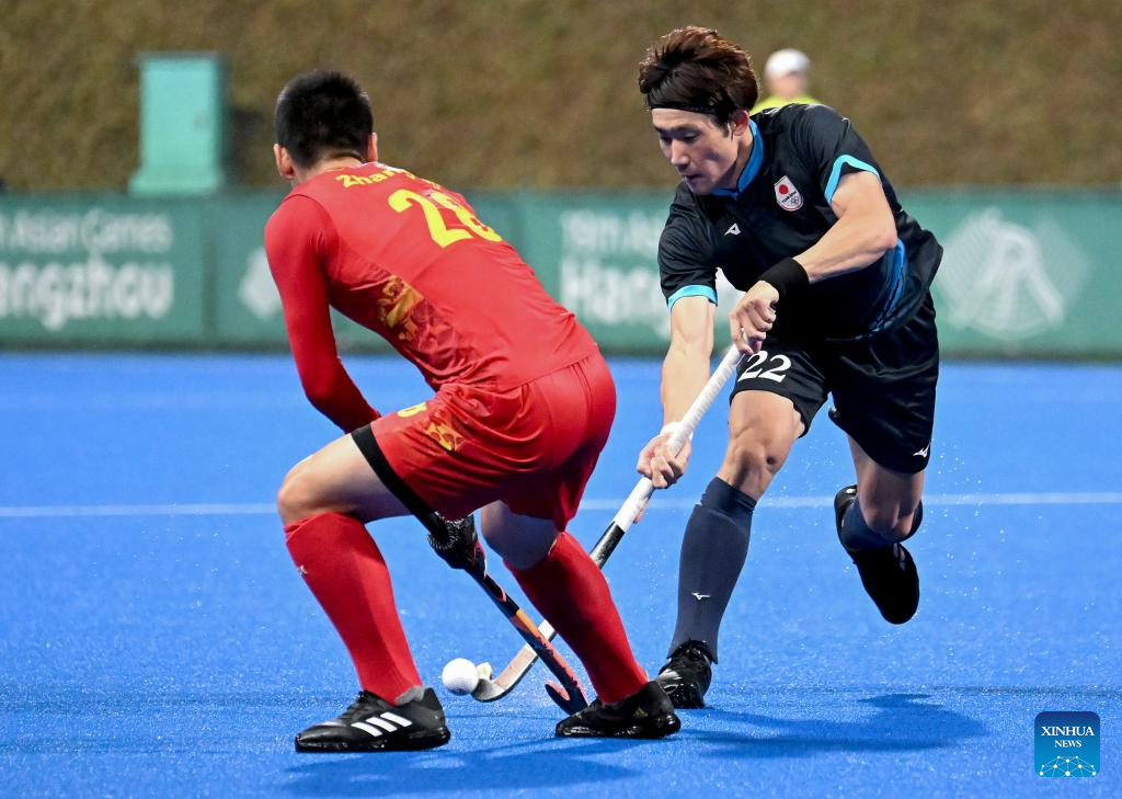 Players compete during Men's Semifinal of Hockey between China and Japan at the 19th Asian Games in Hangzhou, east China's Zhejiang Province, Oct. 4, 2023. (Xinhua/Li An)
