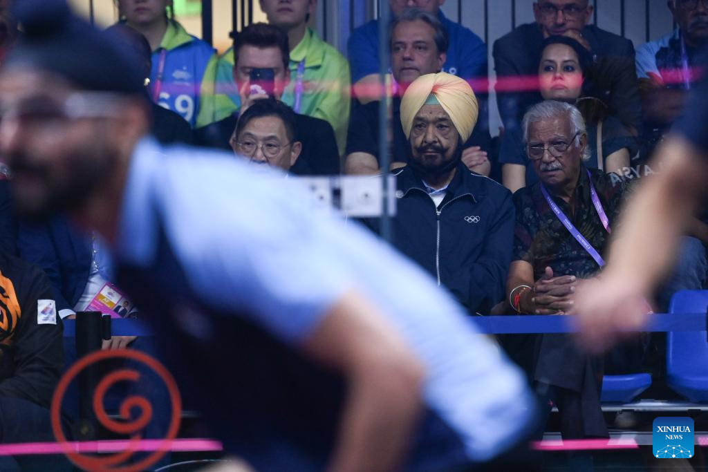 Raja Randhir Singh (C), acting president of the Olympic Council of Asia (OCA), watches the Mixed Doubles Final of Squash between Aifa Binti Azman/Mohammad Syafiq Bin Mohd Kamal of Malaysia and Dipika Pallikal Karthik/Harinder Pal Singh Sandhu of India at the 19th Asian Games in Hangzhou, east China's Zhejiang Province, Oct. 5, 2023. (Xinhua/Huang Zongzhi)