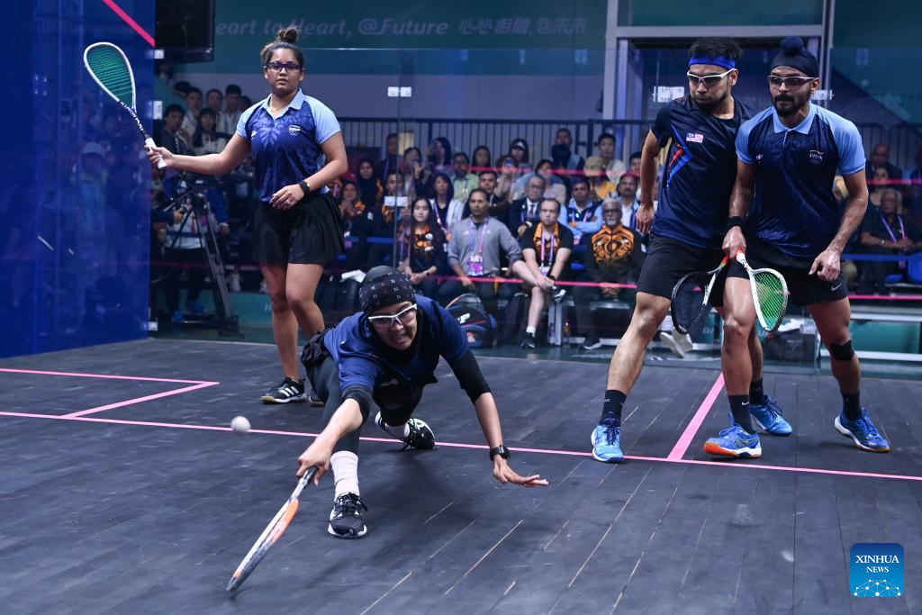 Aifa Binti Azman (2nd L) of Malaysia competes during the Mixed Doubles Final of Squash between Aifa Binti Azman/Mohammad Syafiq Bin Mohd Kamal of Malaysia and Dipika Pallikal Karthik/Harinder Pal Singh Sandhu of India at the 19th Asian Games in Hangzhou, east China's Zhejiang Province, Oct. 5, 2023. (Xinhua/Huang Zongzhi)