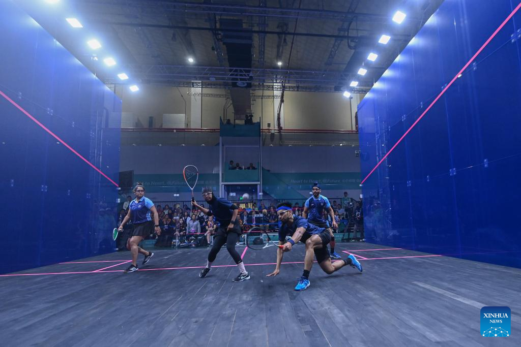 Aifa Binti Azman (2nd L)/Mohammad Syafiq Bin Mohd Kamal (2nd R) of Malaysia compete during the Mixed Doubles Final of Squash between Aifa Binti Azman/Mohammad Syafiq Bin Mohd Kamal of Malaysia and Dipika Pallikal Karthik/Harinder Pal Singh Sandhu of India at the 19th Asian Games in Hangzhou, east China's Zhejiang Province, Oct. 5, 2023. (Xinhua/Huang Zongzhi)