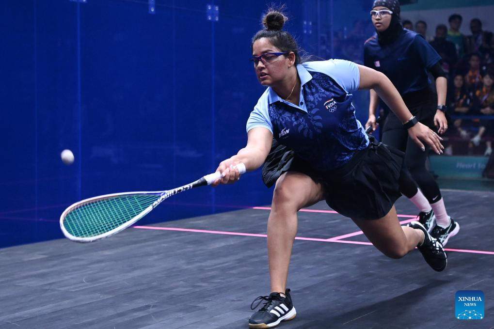 Dipika Pallikal Karthik of India competes during the Mixed Doubles Final of Squash between Aifa Binti Azman/Mohammad Syafiq Bin Mohd Kamal of Malaysia and Dipika Pallikal Karthik/Harinder Pal Singh Sandhu of India at the 19th Asian Games in Hangzhou, east China's Zhejiang Province, Oct. 5, 2023. (Xinhua/Huang Zongzhi)
