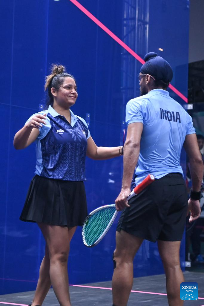 Dipika Pallikal Karthik (L)/Harinder Pal Singh Sandhu of India compete during the Mixed Doubles Final of Squash between Aifa Binti Azman/Mohammad Syafiq Bin Mohd Kamal of Malaysia and Dipika Pallikal Karthik/Harinder Pal Singh Sandhu of India at the 19th Asian Games in Hangzhou, east China's Zhejiang Province, Oct. 5, 2023. (Xinhua/Huang Zongzhi)