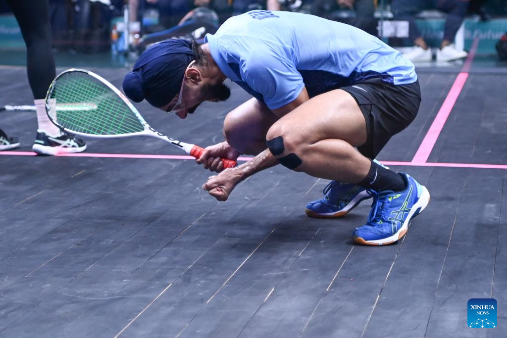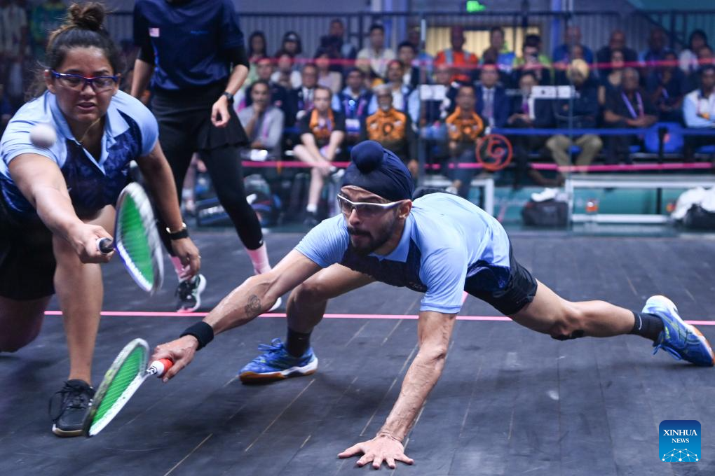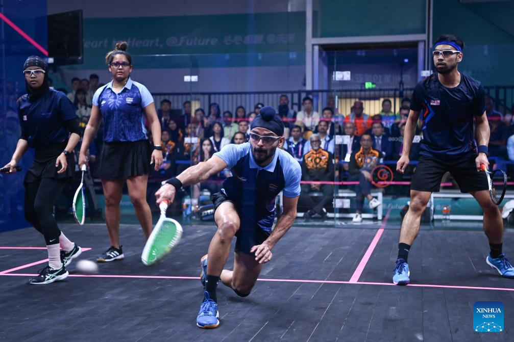 Harinder Pal Singh Sandhu (2nd R) of India competes during the Mixed Doubles Final of Squash between Aifa Binti Azman/Mohammad Syafiq Bin Mohd Kamal of Malaysia and Dipika Pallikal Karthik/Harinder Pal Singh Sandhu of India at the 19th Asian Games in Hangzhou, east China's Zhejiang Province, Oct. 5, 2023. (Xinhua/Huang Zongzhi)