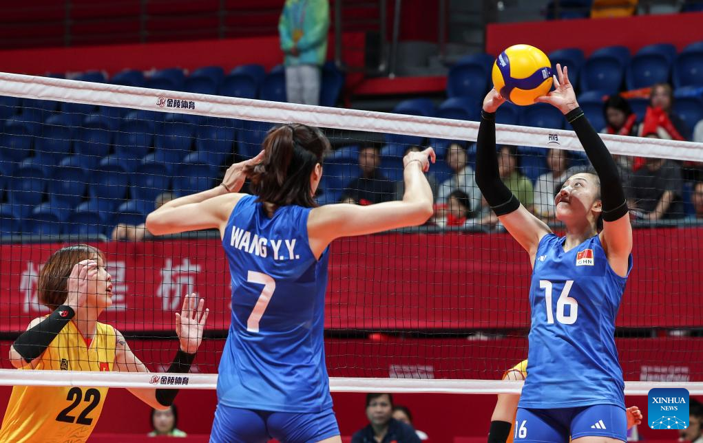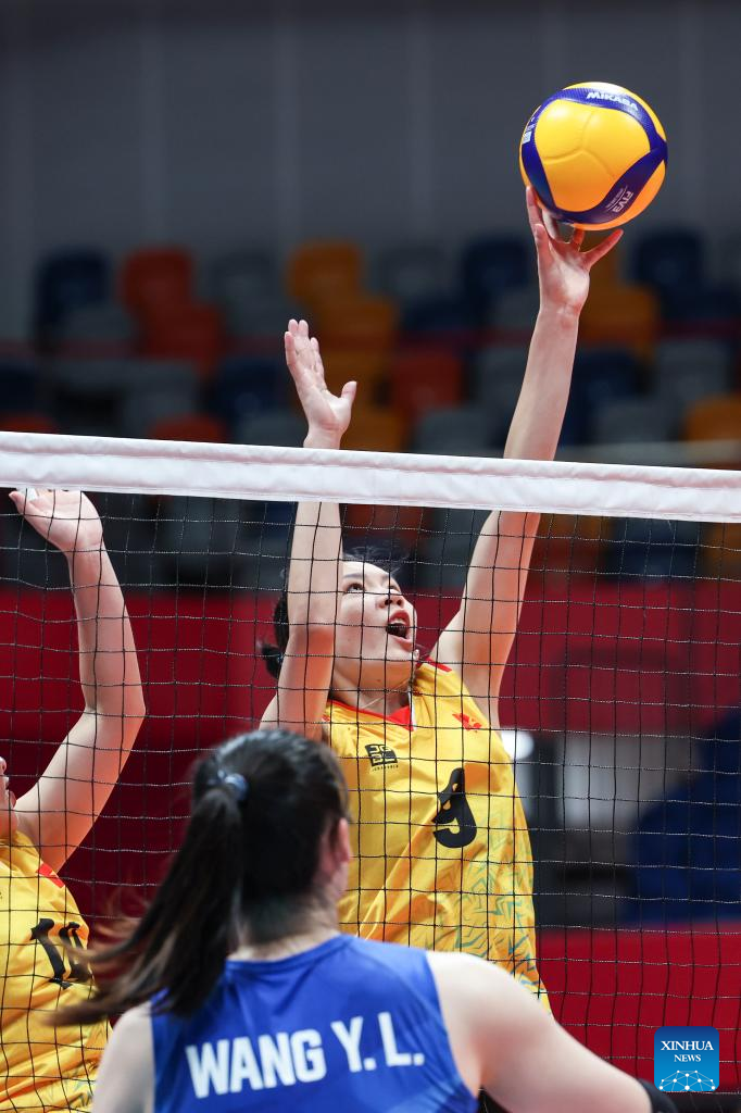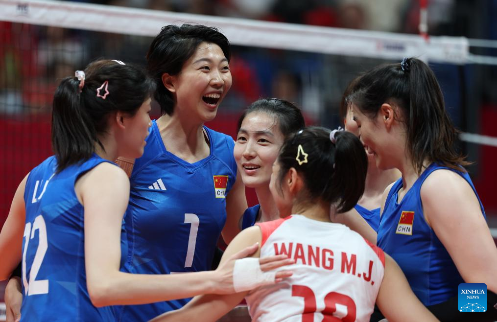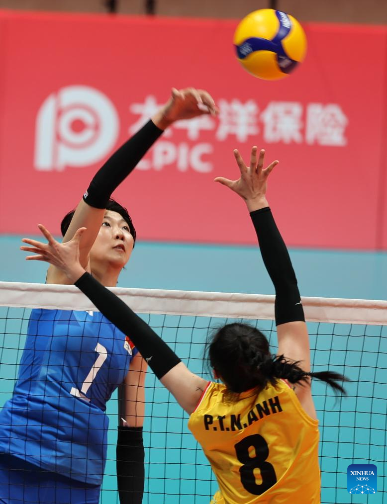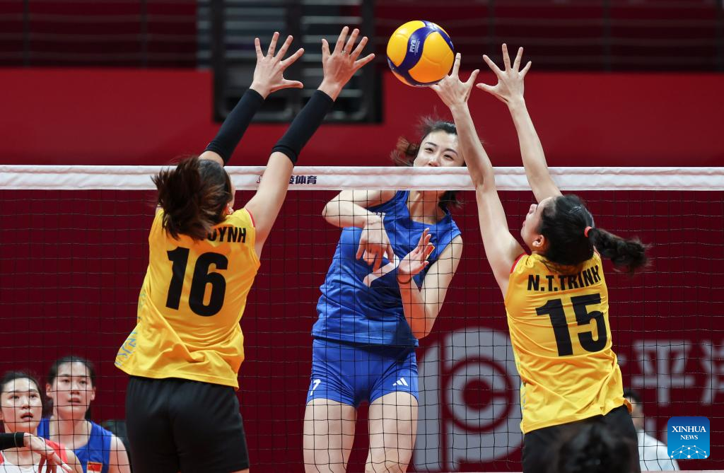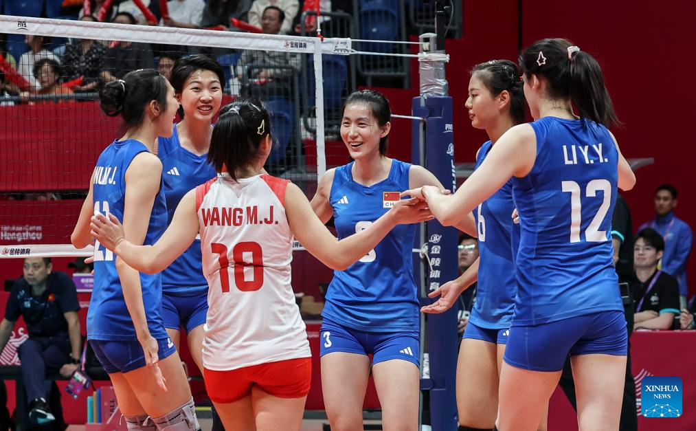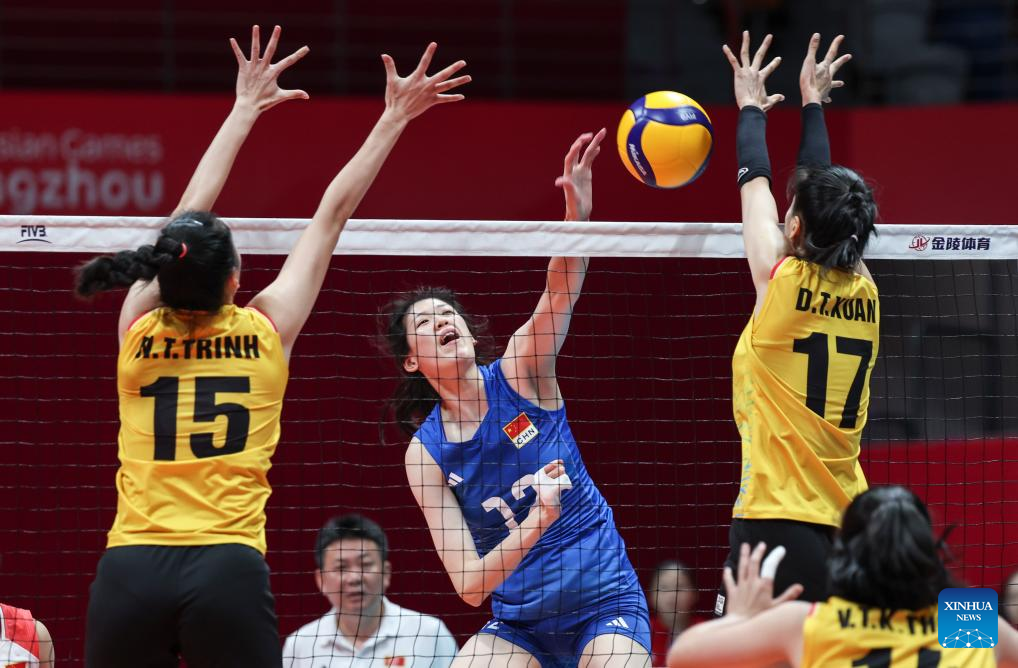 HANGZHOU, Oct. 5 (Xinhua) -- China thrashed Vietnam 3-0 to top Pool E on Thursday and will take on Thailand in the women's volleyball semifinals at the Hangzhou Asian Games.