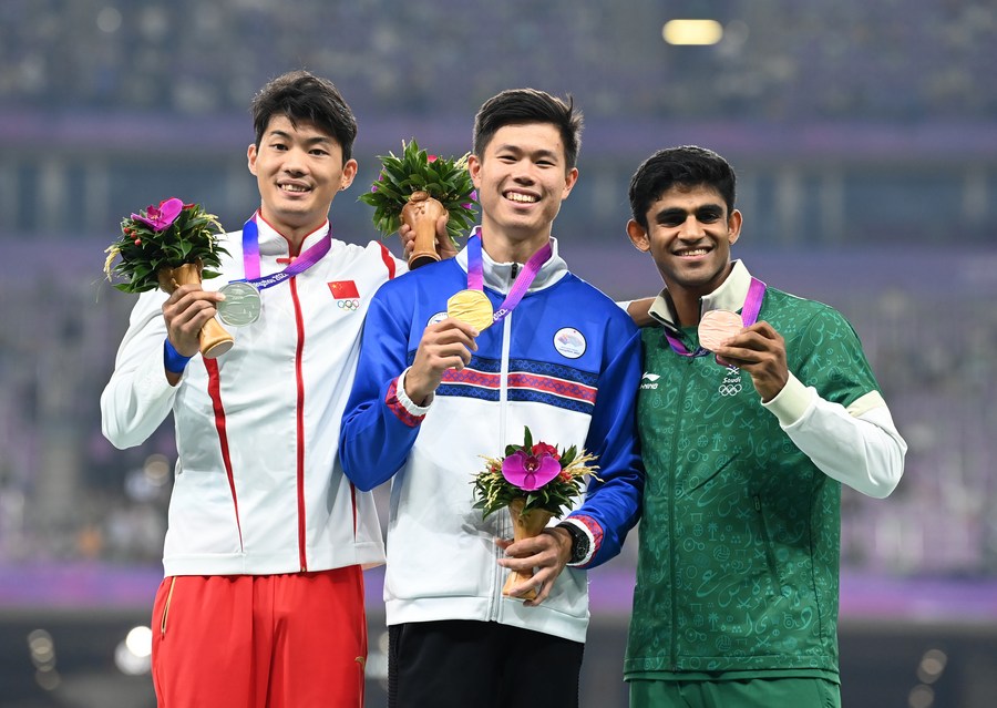 Ernest John Obiena (C) of the Philippines, Huang Bokai (L) of China and Hussain Al-Hizam (R) of Saudi Arabia attend the awarding ceremony for the men's pole vault at the Hangzhou Asian Games on Sept. 30, 2023. (Xinhua/Jiang Han)