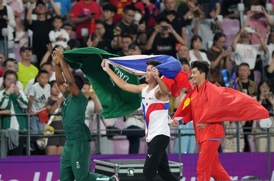 HANGZHOU, Oct. 4 (Xinhua) -- Pole vaulter Ernest John Obiena had much to celebrate at the Hangzhou Asian Games, clinching the Philippines' first gold medal and setting an Asian Games record. His success is undoubtedly the result of years of hard training, but it also reflects friendship and international cooperation.