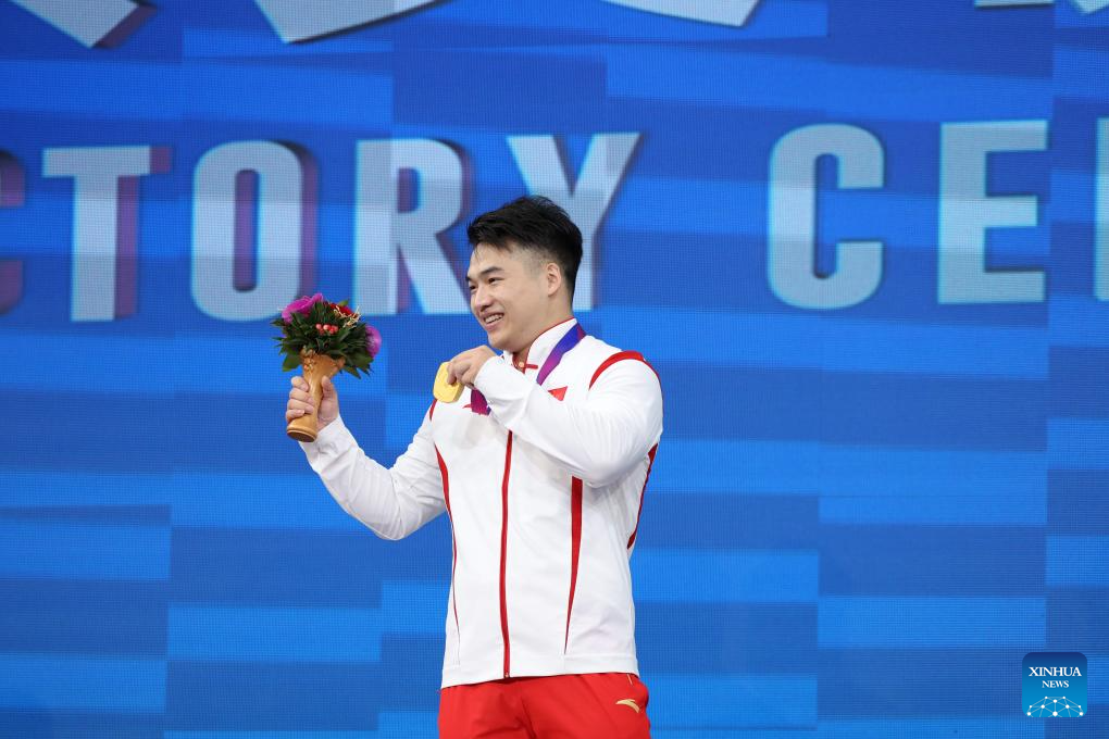 Gold Medalist Tian Tao of China attends the awarding ceremony for Men's 96Kg Group A match of Weightlifting at the 19th Asian Games in Hangzhou, east China's Zhejiang Province, Oct. 5, 2023. (Xinhua/Yang Lei)