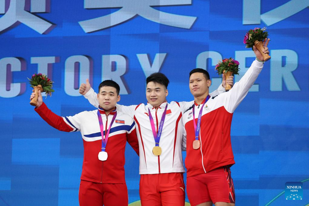 Gold Medalist Tian Tao (C) of China, Silver Medalist Ro Kwangryol (L) of Democratic People's Republic of Korea (DPRK) and Bronze Medalist Sarat Sumpradit of Thailand attend the awarding ceremony for Men's 96Kg Group A match of Weightlifting at the 19th Asian Games in Hangzhou, east China's Zhejiang Province, Oct. 5, 2023. (Xinhua/Yang Lei)