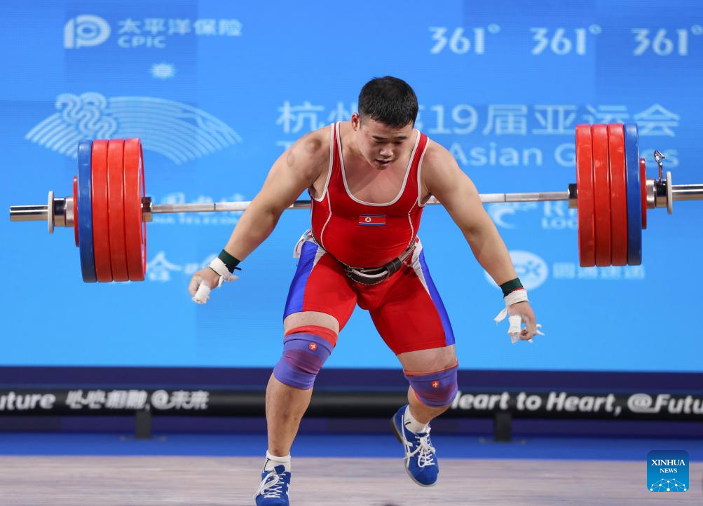 Ro Kwangryol of Democratic People's Republic of Korea (DPRK) competes during Men's 96Kg Group A match of Weightlifting at the 19th Asian Games in Hangzhou, east China's Zhejiang Province, Oct. 5, 2023. (Xinhua/Yang Lei)