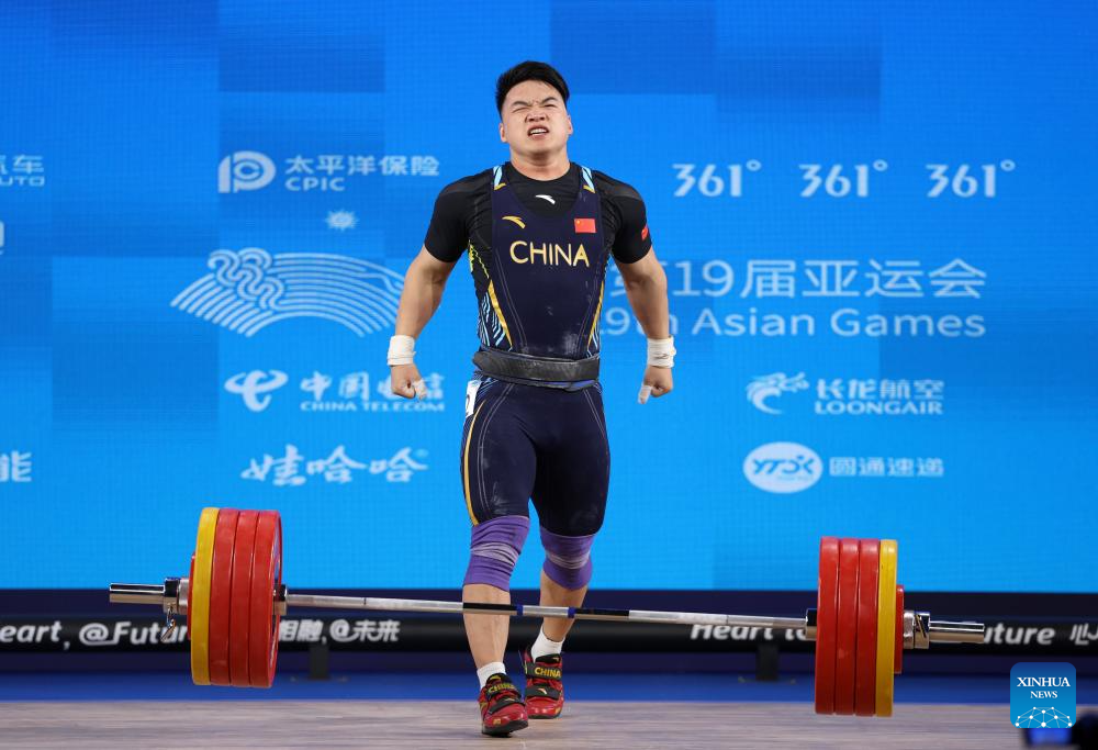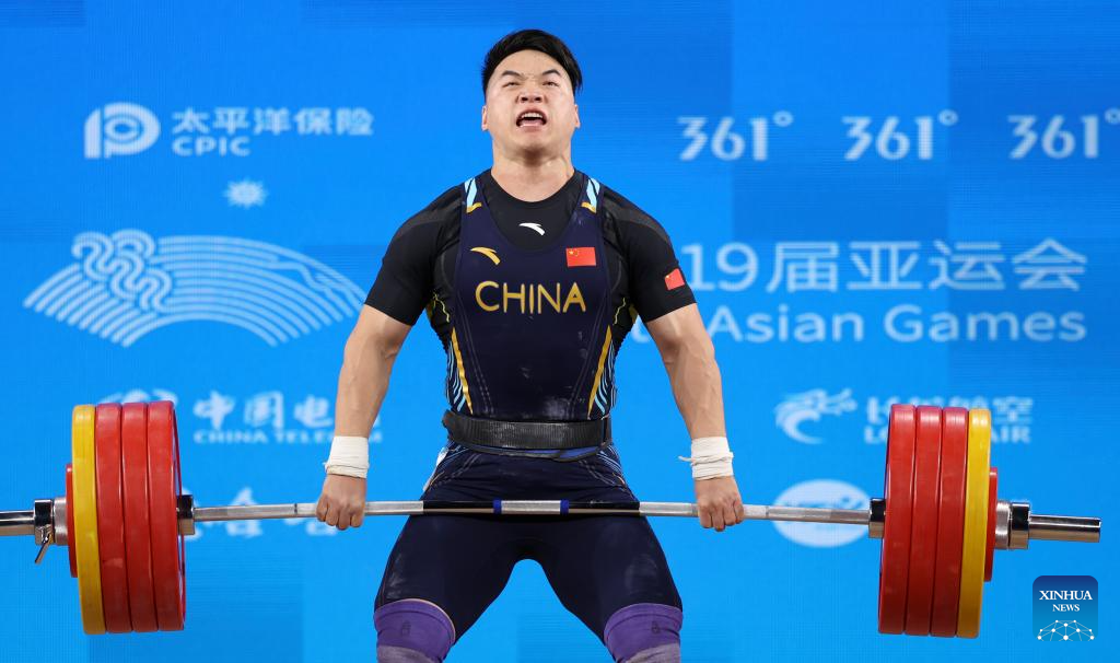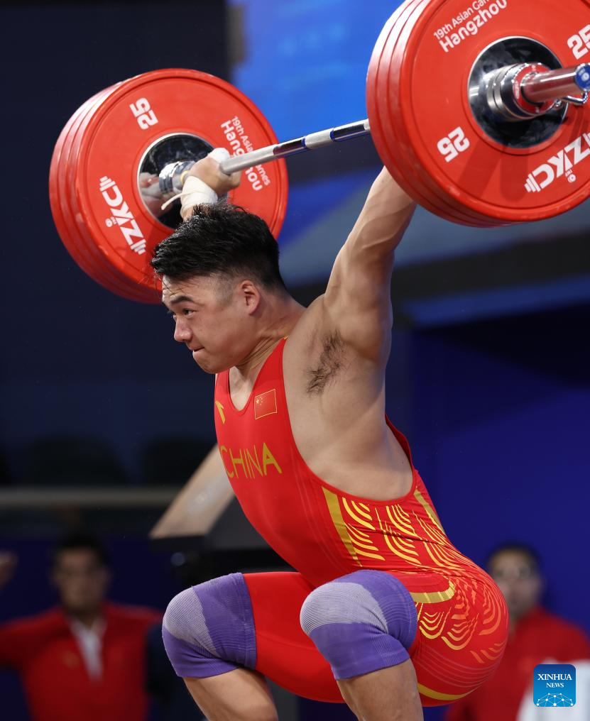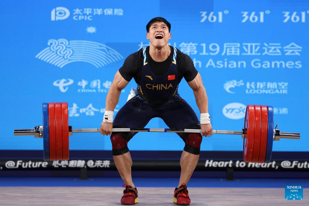 Li Dayin of China competes during Men's 96Kg Group A match of Weightlifting at the 19th Asian Games in Hangzhou, east China's Zhejiang Province, Oct. 5, 2023. (Xinhua/Yang Lei)