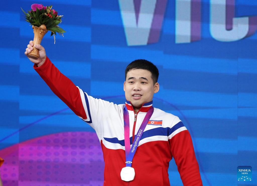 Silver Medalist Ro Kwangryol of Democratic People's Republic of Korea (DPRK) attends the awarding ceremony for Men's 96Kg Group A match of Weightlifting at the 19th Asian Games in Hangzhou, east China's Zhejiang Province, Oct. 5, 2023. (Xinhua/Yang Lei)