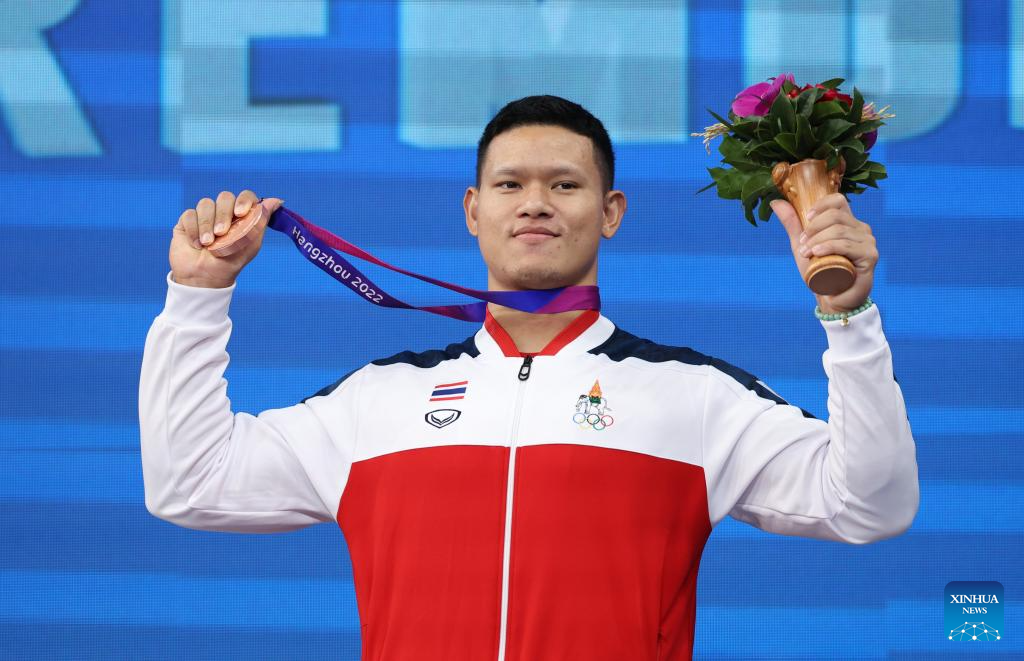 Bronze Medalist Sarat Sumpradit of Thailand attends the awarding ceremony for Men's 96Kg Group A match of Weightlifting at the 19th Asian Games in Hangzhou, east China's Zhejiang Province, Oct. 5, 2023. (Xinhua/Yang Lei)
